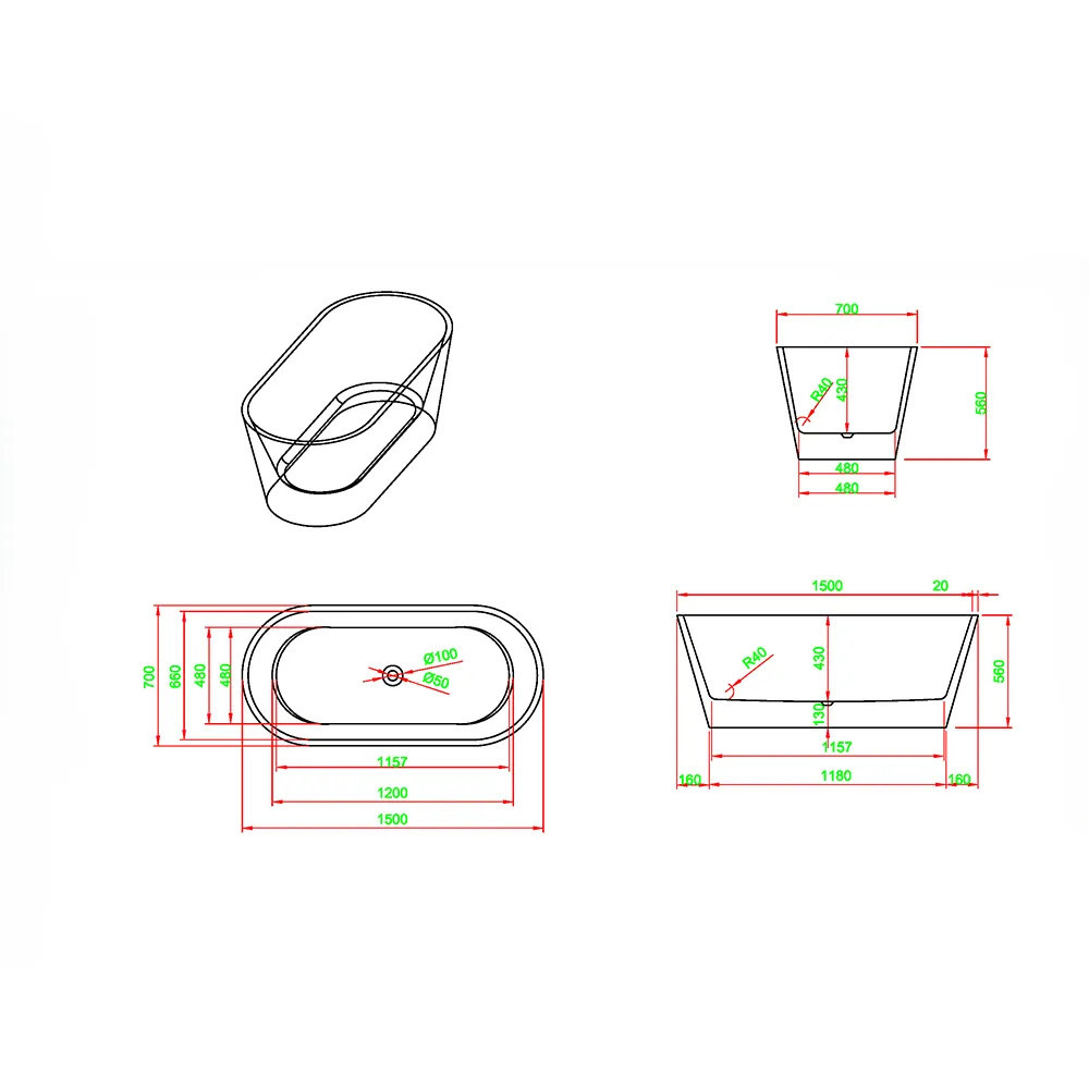 Noa szabadon álló fürdőkád 150x70x56 cm