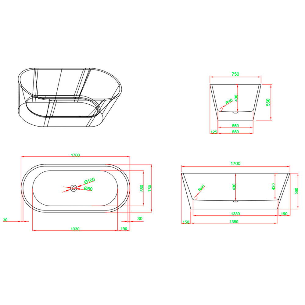 Noa szabadon álló fürdőkád 170x75x56 cm fekete